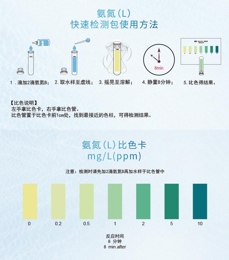 2.本產(chǎn)品檢測水中游離態(tài)的氨(NH3)或銨離子(NH4+)含量在0-10mg/L(ppm)范圍內(nèi),若要檢測10mg/L以上濃度水樣,請預(yù)先稀釋水樣后再進(jìn)行測定,具體操作見稀釋說明書。