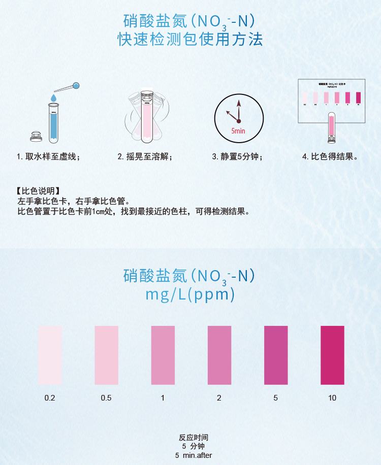 2.本產(chǎn)品檢測水中硝酸鹽氮(NO3- -N)含量在0.2-10mg/L(ppm)范圍內(nèi),若要檢測5mg/L以上濃度水樣,請預(yù)先稀釋水樣后再進(jìn)行測定,具體操作見稀釋說明書。