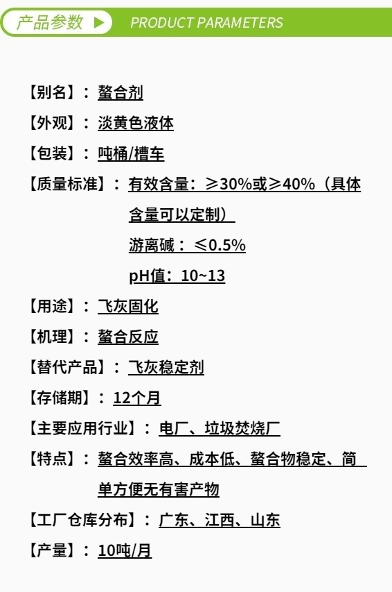飛灰螯合劑是一種專門用于處理電廠、垃圾焚燒產(chǎn)生的飛灰重金屬的螯合劑,采用接枝工藝合成,經(jīng)過分子結(jié)構(gòu)層面的系統(tǒng)設(shè)計組合形成更復(fù)雜的架橋結(jié)構(gòu),分子極性增加,因而具有更強的重金屬螯合能力。